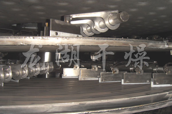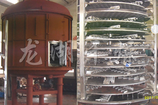 wet material is continuously added to the first layer of the upper drying plate of the dryer from the feeder, and the arm with the sinuous leaf is used for the rotary motion, so that the arm can make a turning motion so that the loquat leaf can be continuously turned. The material flows along the exponential helix across the surface of the drying pan. The material on the small drying pan is transferred to the outer edge and falls on the outer edge to the outer edge of the large drying pan below. In the large dry pan, the material moves inwards and falls from the middle The material outlet falls in a small dry pan as follows. The size of the drying trays alternates up and down, allowing the material to flow continuously through the dryer. The heating medium is introduced into the hollow drying tray. The heating medium is in the form of saturated steam, hot water, and heat-conducting oil. The heating medium enters from one end of the drying tray and is led out from the other end. The dried material falls from the last layer of the drying tray to the bottom layer of the shell and is finally moved by the lobe leaves to the discharge port. The moisture content escapes from the material and is discharged from the moisture outlet provided on the top cover. The moisture of the vacuum type tray dryer is discharged from the vacuum pump port provided on the top cover. Dry material discharged from the bottom can be packaged directly. By adding fin heaters, solvent recovery condensers, bag filter, dry material back mixing mechanism, induced draft fan and other auxiliary machines, it can increase its dry production capacity, dry paste and heat sensitive materials, and can be easily recycled. Solvents, and pyrolysis and reaction operations.